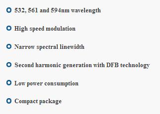 QLD0593 series are compact visible laser module, which integrate 1064-1188nm lasers with SHG (second harmonic generation) devices of PPLN (Periodically Poled LiNbO3). Different from a DPSS laser (Diode-Pumed Solid-State laser), this laser utilizes DFB laser technology, which provides video rate amplitude modulation capability and narrow spectral linewidth. These features are for projectors and microscopy and also for spectroscopy and sensing applications.
